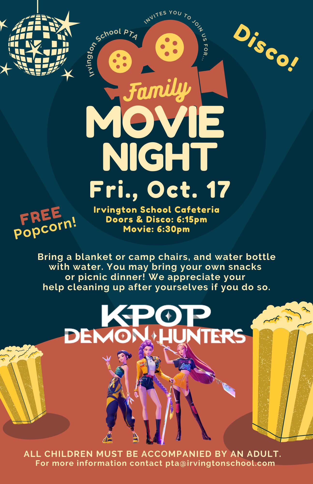 When: See PTA Calendar for dates. Doors open and disco party at 6:15pm, movie begins at 6:30pm.